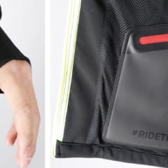 (左)袖口はサムホール仕様になっているのがユニーク。乗車中に袖がズレて手首がカッコ悪く日焼けしてしまうのを防ぐのにも便利だ。(右)内側には防水ポケットを装備して、急な天候変化からスマホなど大事なものを保護してくれる。ポケットのファスナーも防水仕様だ。