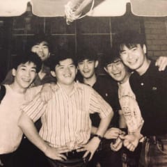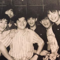 1993年第2戦マレーシアGPレース前に、みんなで行ったチャイナタウンの中華料理屋にて撮影。事故の後、若井さんのカメラに残されていたフィルムを現像したものだ。左から坂田和人さん、若井さんのメカニック、店員さん、原田哲也さん、上田昇さん、そして若井伸之さん 。