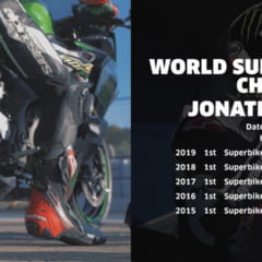 33歳の絶対王者、ジョナサン・レイ選手の輝かしい戦績とともにNinja ZX-25Rへと乗り込む姿が。