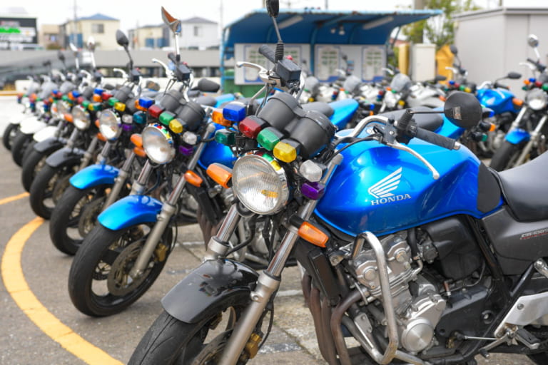 ホンダの施設なので、当然ながら教習車はホンダ車。普通二輪免許用は大定番のCB400スーパーフォア、大型二輪教習用はNC750Lだ。和光校だけで100台以上を所有。スクールで使う車両は、免許教習車とは別に用意されている。
