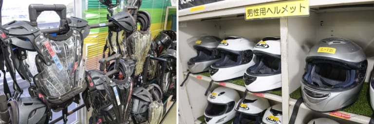 フルフェイスヘルメットや肘&膝&ボディプロテクターはレンタルも可能。例えば仕事帰りでも、少ない荷物で教習に立ち寄れる。技能教習時はプロテクター類の装着が必須となっているが、事前に購入しなくてよいのもうれしい!