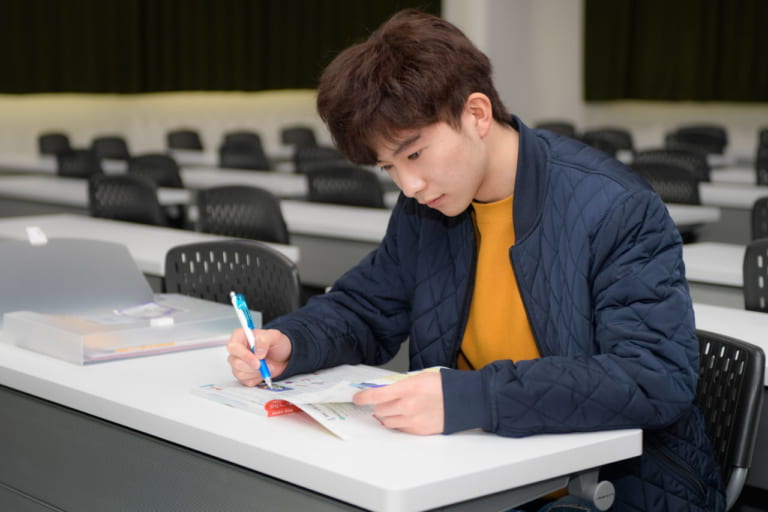 入校手続きに続いて、施設の案内や教習の進行についての説明、適性検査と1時限目の学科教習を受けた。写真は、休憩時間にちょっぴり予習する竜太郎さん。