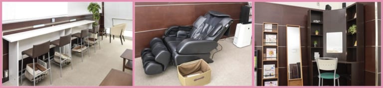 レインボーモータースクール和光は、女性専用ラウンジを完備。豊富なテーブル&チェアに加えて、パウダーコーナーやスマホなどの充電設備、漫画や雑誌、マッサージチェアまで用意されている。次の教習やスクールバスの待ち時間を、女性専用エリアで快適に過ごせるのだ!