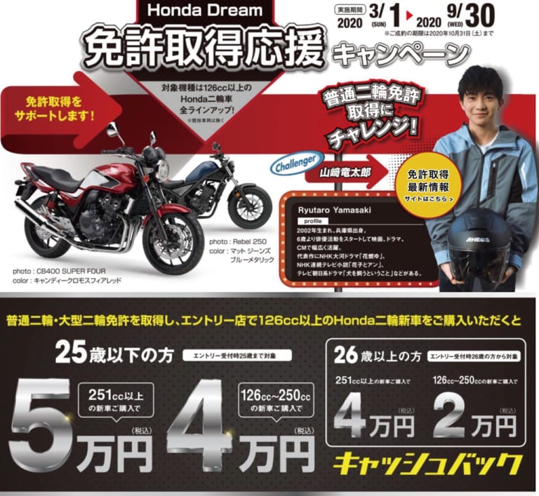 Honda Dream の「免許取得応援キャンペーン(3/1~9/31)」は大型二輪免許へのステップアップ組も要注目