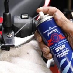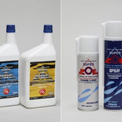 (右)スーパーゾイルをエアーゾールに詰めたオイルスプレー。このような製品は、他にあるようでない。さまざまな使い方が可能だ。白いパッケージのチェーンルーブもファンが多い。スーパーゾイル・スプレー〈280ml〉●価格:2200円、スーパーゾイル・チェーンルーブ〈220ml〉●価格:2000円
