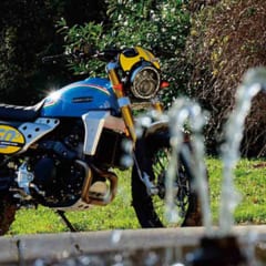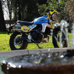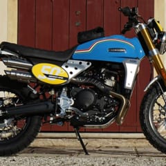【FANTIC CABALLERO SCRAMBLER 500 ANNIVERSARY】■全長2166 全幅820 全高1135mm 軸距1425 シート高820mm(各mm) 車重150kg ■水冷4ストローク単気筒 SOHC4バルブ 449cc 40ps/7500rpm 4.3kg-m/6000rpm ■150kg 12L ■タイヤF=110/80-19 R=140/80-17 ●価格:123万円