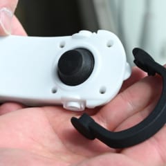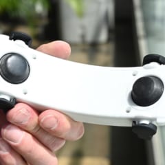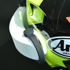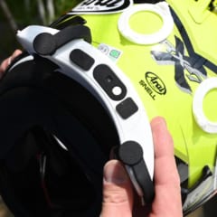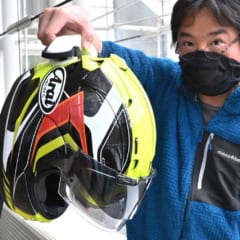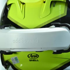 左右に2つの骨伝導スピーカーが内蔵され、ステレオサウンドを再生。Bluetoothでスマートフォンなどの携帯電話に接続し、走行中に音楽やナビの音声を聞くことができる。走行して風切り音が発生すると自然にボリュームアップする仕組みだ。持ってみた印象はスマートフォン1個分の重さぐらい。