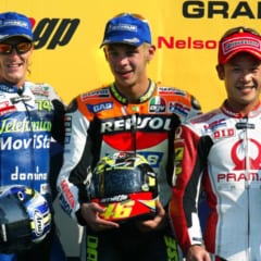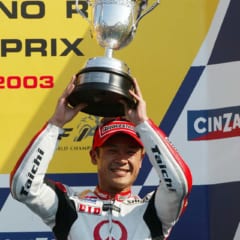 2003年第12戦リオGPで3位となり、初表彰台登壇を果たした玉田誠選手。ロードレース世界選手権の最高峰クラスでブリヂストンが表彰台圏内を獲得するのもこれが初。しかし、「我々が掲げた最終的な目標は優勝そしてチャンピオンですから、たいしたお祝いはしませんでした」と山田さん。