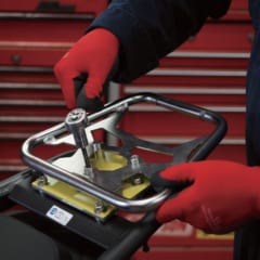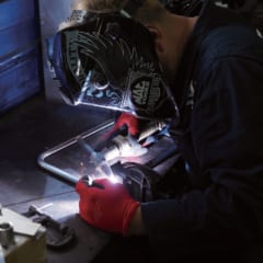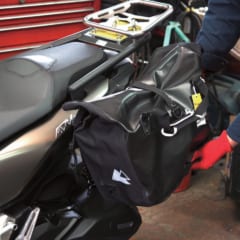 ツアラテック製の汎用ステーを車両にボルトオン装着できるようなステーを溶接。ソフトパニア巻き込み防止用だ。