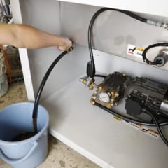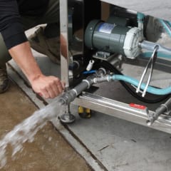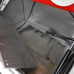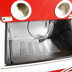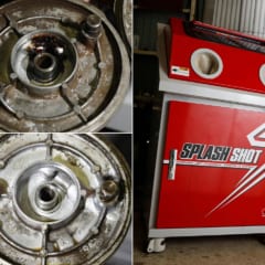 【カーベック スプラッシュショット】完全なるパッケージ&ユニット設計のため、作業現場周辺を汚してしまうことなく清潔な環境の中で作業できる。プロユーザーの採用例は多い。(左上下)たとえばブレーキパネル内側に固着している古いグリスの塊洗浄に強烈な洗浄能力を発揮。10秒程度の洗浄でこの仕上がりに。まさにタイムイズマネーだ。●価格:74万8000円(税/送料別)