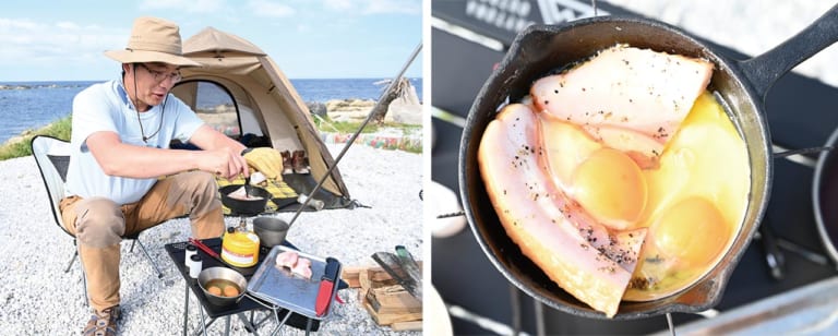 朝食はニトリのスキレット、通称”ニトスキ”で厚切りベーコンエッグ。卵も贅沢に2個落としてしまってご満悦。