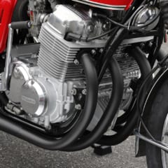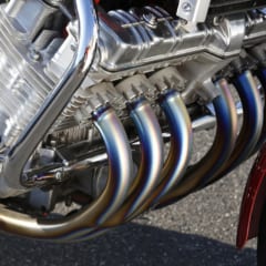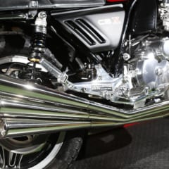 ダイヤモンドフレームに6気筒エンジンを吊り下げるCBX。シリンダーヘッド前後2カ所(左右計4カ所)のエンジンハンガープレートを、キラリと輝くアルミで製作。