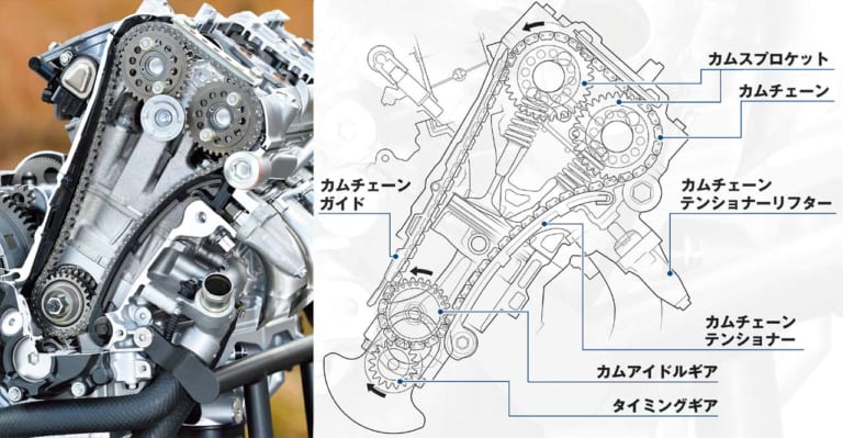超高回転で回転するクランクシャフトは、ピストンの慣性力や燃焼の力により、常に上下に激しく変形しています。特にシャフトの端の方は軸受けからも距離が遠く、変形が結構大きいのです。その動きの激しい部分にカムチェーンのドライブギヤを配置すると(通常はそこに配置するしかない)、クランクの変形でカムチェーンが強く加振されてしまい、カムチェーンのメカ音やテンショナーの摩耗、アジャスターの破損やチェーンの折損といったトラブルが発生しやすくなるのです。