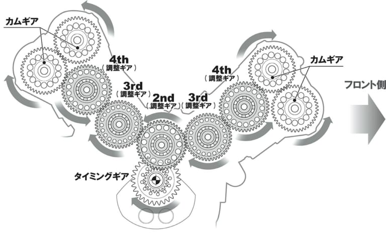 もう1点、RR-Rのセミカムギヤトレイン方式が優れている点としては、BMW方式よりヘッドの幅を抑えられることです。BMW式はヘッドのいちばん幅広い部分にギヤを固定するため、さらにヘッドの幅を広げてしまうのに対し、RR‐R方式は従来のカムチェーン式と何ら変わりません。これはヘッド幅が車体側のネックになりやすい直4エンジンでは、非常に意味のあることだと思います。
