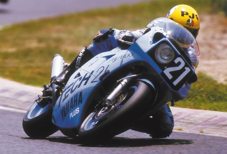 メカは革新技術のオンパレードで、吸気×3、排気×2という世界初の5バルブ直4エンジンが目玉。中低速トルクを増強し、高回転化にも有利という夢の機構だ。以降も5バルブはYZF-R1や’00年代のモトGPマシンにまで継承され、ヤマハを代表するメカとなった。