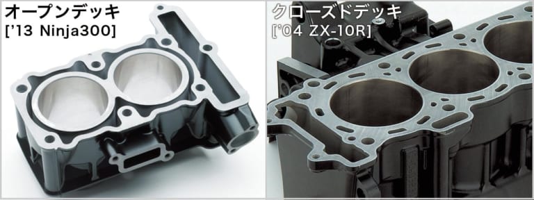 【オープンデッキとクローズドデッキの違い】オープンデッキはスリーブ上端の支持剛性が低いものの、生産性に優れる。クローズドデッキはその逆だが、高性能を求めるスーパースポーツ系はほぼ全てがクローズドデッキを採用する。
