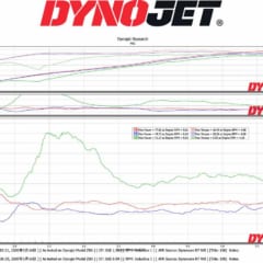 【アクセル全開】上はパワー&トルク曲線。中はFシリンダー、下はRシリンダーの空燃比(ガソリンの濃さで、13:1が理想)。緑グラフの薄さが際立つ上に、青グラフの全般的に濃い状態が確認できる。