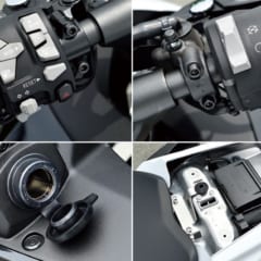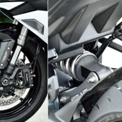 試乗車は純正アクセサリーのフレームスライダー(1万7710円)を装備。標準装着タイヤはブリヂストンのS20からS22へと進化した。キャスター/トレールは24.5°/102mmから24.0°/98mmへ。車重は1kg増の236kgとなった。