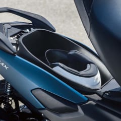 シート下トランクは容量約24Lで、ヘルメット1個を収納可能(形状による)。フロントポケットには500mlペットボトルを収納できるほか、給油口を足元に設けることで、シートを開けることなく給油が可能になっている。
