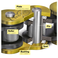 Mエンデュランスチェーンは、ローラーとブッシュに施したta-Cコーティングにより、ピンとの接触部分およびスプロケットとの接触部分に高い硬度と耐久性、そして低い摩擦係数を実現する。