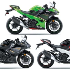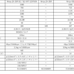 [Ninja ZX-25R]3つのグレード名が用意され、それぞれに専用のカラーリングが割り当てられる。SEとSE KRTエディションはスペック的に同じだが、STDに対してはクイックシフターやフレームスライダーといった装備が追加されている。 ●ニンジャZX-25R(上):82万5000円 ●ニンジャZX-25R SE(左下):91万3000円 ●ニンジャZX-25R SE KRTエディション(右下):91万3000円