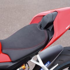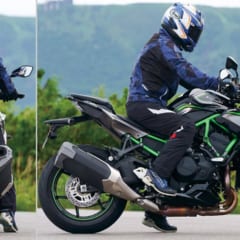 【Z H2】真下に足を下せる感覚で、両足の母指球までが接地する。ニーグリップ時に、メインフレームが膝の内側に当たるのが少し気になる。正統派のネイキッドポジションに近く、ハンドルはやや絞られてシートからの距離は遠くない。