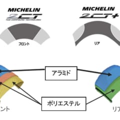 【上段】フロントに2CT、リヤには2CT+を採用。1本のタイヤの中で、タイヤ中央部とショルダー部で異なるコンパウンドを使い分ける。最適化された配合率のシリカコンパウンドとカーボンブラックを適用した。【下段】ケーシングには軽量で強度の高いアラミド繊維を採用。軽量化とレスポンス向上に貢献する。
