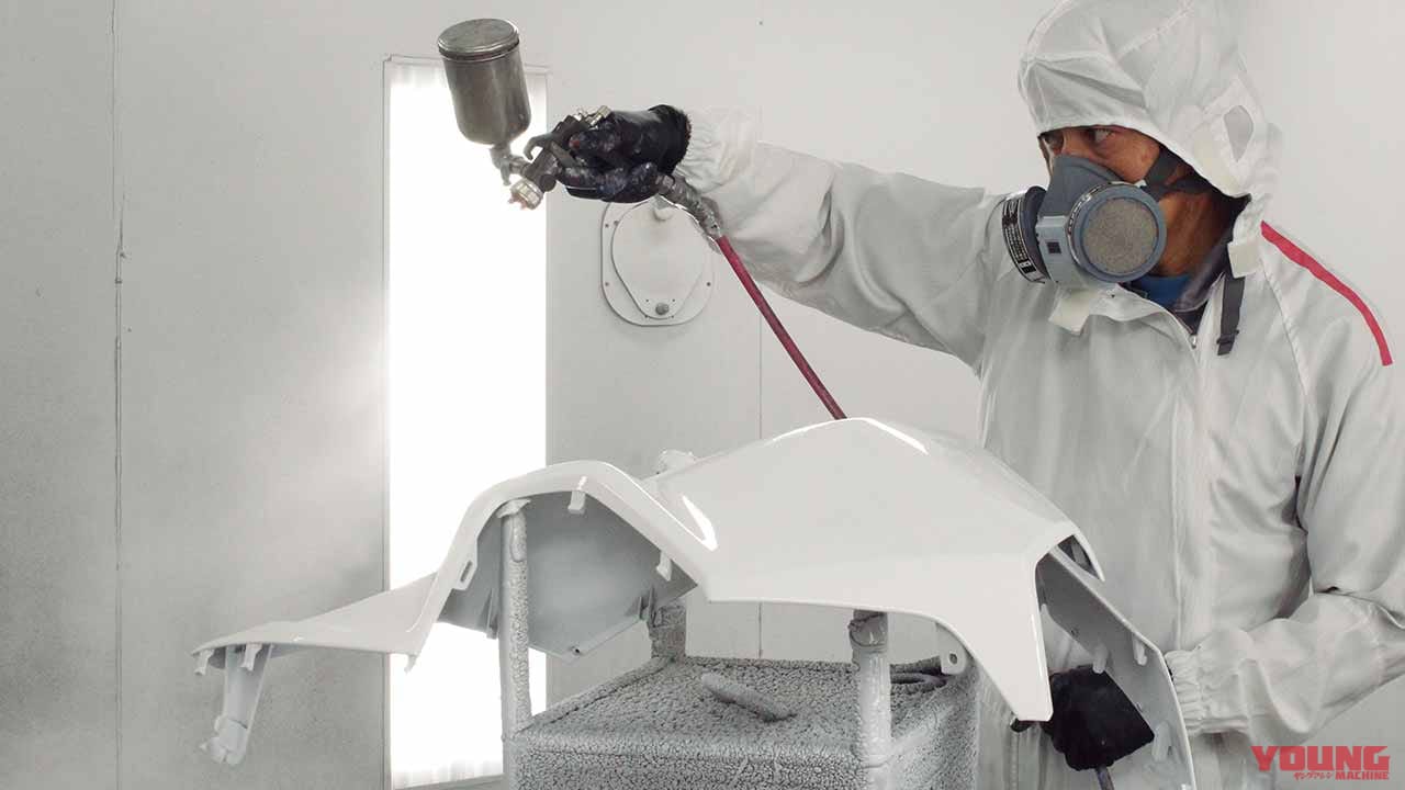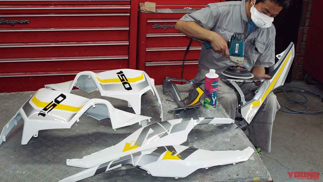 しかしながら、ドリーム商會でペイントした外装パーツとカーベックでパウダーコートしたホイール&クラッシュガードを前に、ベテランメカニックにも普段とは違う緊張があるようだ。品質追求に余念のない最近のバイクは、外装パーツの組み合わせが複雑かつタイトで「カウルの取り外し作業自体は日常茶飯事ですが、メーカー純正ペイントとカスタムペイントでは塗膜の厚みや塗料の種類が異なる場合があるので、気を遣いますね」とアトラクティブ代表の後田吾郎氏。