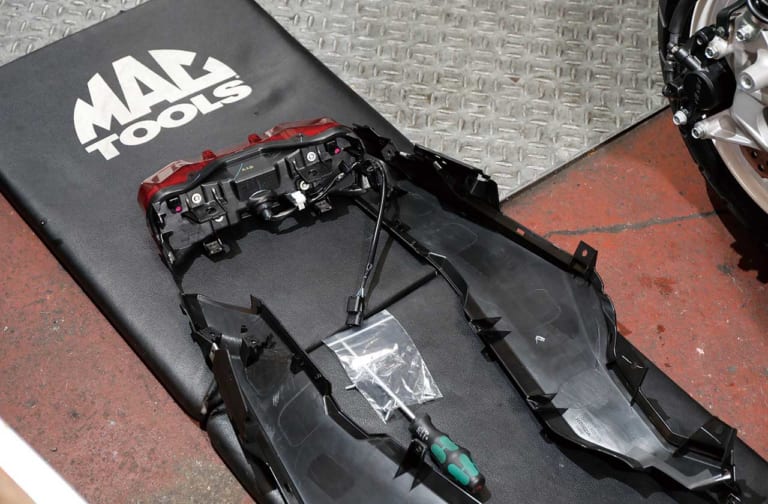 シート下のサイドカウルはテールランプを中心とした左右一体式。ペイント済みカバーを先に組み付ける。