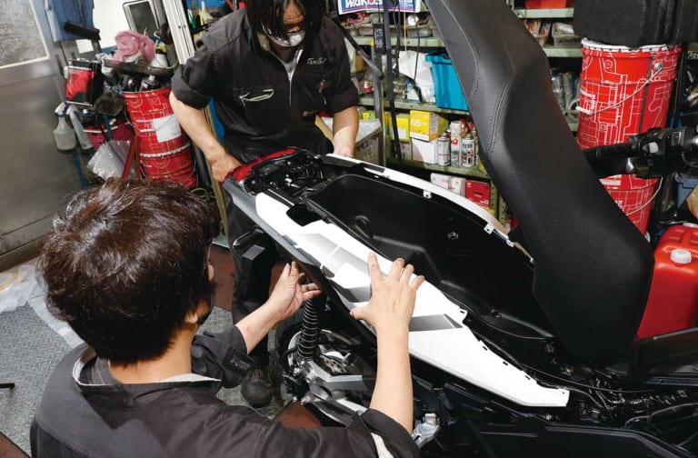 【緩急つけた作業で組み立て完了】「後付けのクラッシュガードも苦労したけど、何よりカスタムペイント済みパーツは慎重になるよね」と後田代表。手の掛かるスクーターの外装復元、ありがとうございました!!