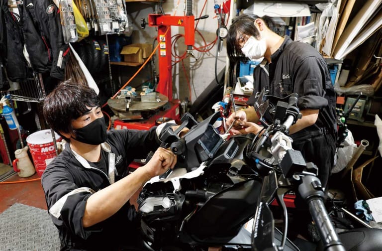 「2ヶ月も前のことなんて覚えてないよね」と言いながら、手際良く作業を進める代表の後田吾郎氏(左)と今井晴彦メカニック。