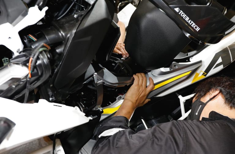 シート下のサイドカウルとヘッドライト横のパネルにつながるカバーがはまりづらい。隙間ができないよう収まりの良い位置を探す。