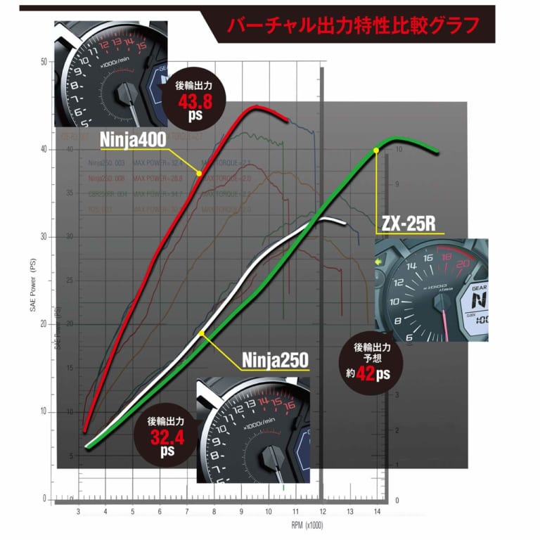 カワサキ ニンジャZX-25Rにとって、完成度の高さで定評ある2気筒ニンジャ250/400は、たとえ同門であっても強力なライバルだ。4気筒ZX-25Rは、2気筒250はもちろんパワーで400も喰えるのか? 過去のパワー測定データから出力特性をシミュレーションするとともに、車体の違いについても比較してみた。