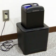 写真左は大阪大学の2つのキャンパスに設置されるバッテリー交換ステーション。写真右はローソンに置かれるポット型の専用充電器。