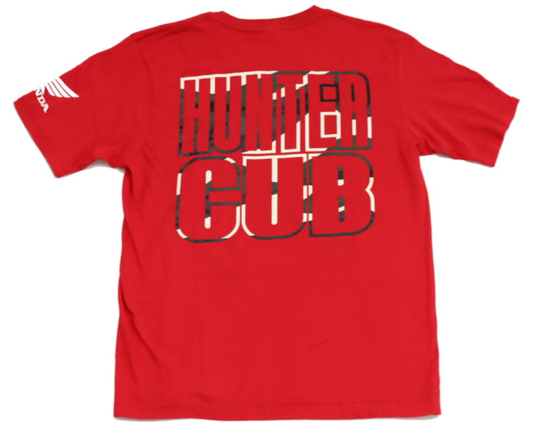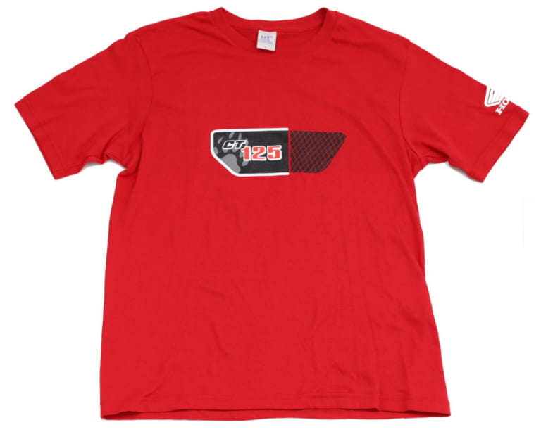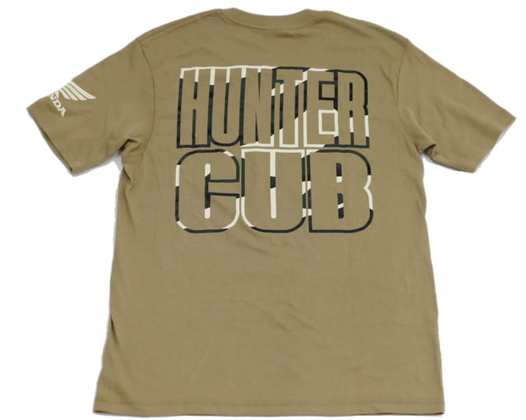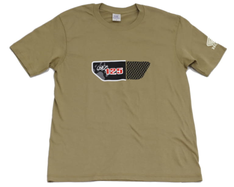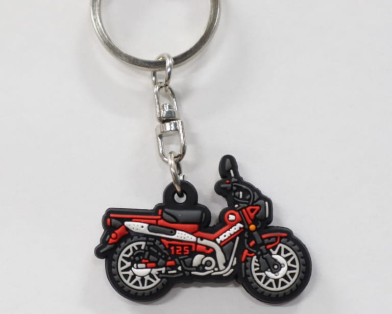 人気のTシャツやキーホルダーはグッズの基本。まずTシャツは、“CT125”ロゴデザインをフロントに、そしてバックには“HUNTERCUB”のロゴを配したコットン素材。カラーリングは車体色を想起させるレッドとサンドベージュの2色設定となる。キーホルダーは、コレクションアイテムとしても人気の高いPVCラバー製だ。表面はハンターカブの車影、裏面にはウイングマークとHONDAのロゴが配される。