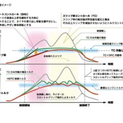 【攻守制御レベルは細やかに設定可能】左表はライディングモード一覧、右図はパワーセレクター出力特性イメージ。出力特性やトラクションコントロールなどを統合制御できる5種類のライディングモードを完備する。速く走るためのモード1をはじめ、走行状況や好みに応じてキメ細かく設定可能。出力特性は5段階を用意し、トラクションがかかり始めて加速する際のパワーが変化する。アクセル全閉から開け始めの扱いやすさは各段階とも同様なので、安心してスポーツできる。