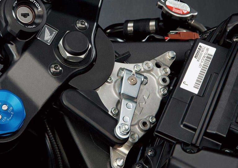 ’09年型から採用した電子制御式コンバインドABSに代わり、最新のスーパースポーツ専用ABSを導入。CBR1000RR(SC77)と同様のシステムで、従来より2500g軽量だ。ニッシン製のABS用ECUが、前後の車輪速センサーとIMUによる車体姿勢の情報を基にブレーキ圧を制御。急制動時におけるリヤリフトを抑えるほか、旋回中のブレーキングでも切れ込みや車体の起き上がりを緩和する。