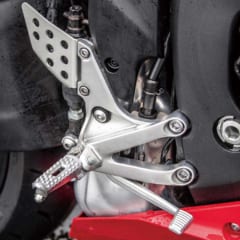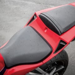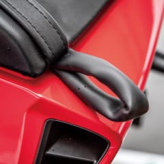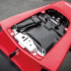 荷掛けフックはシート下の左右2か所に設置。スーパースポーツでは珍しい装備で、使い勝手がいい。