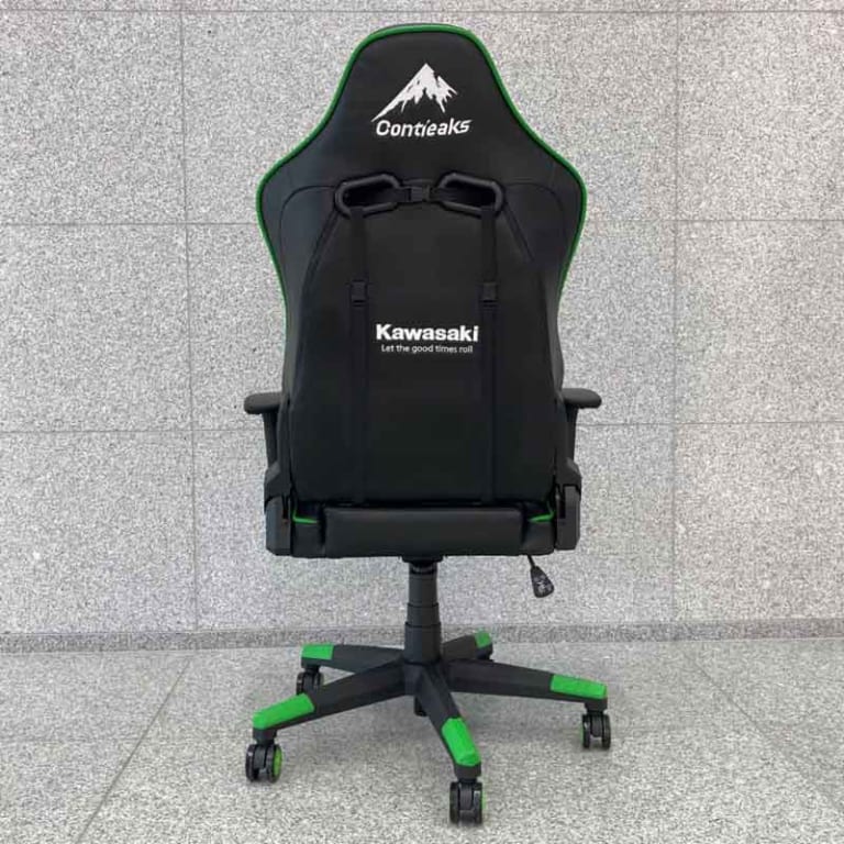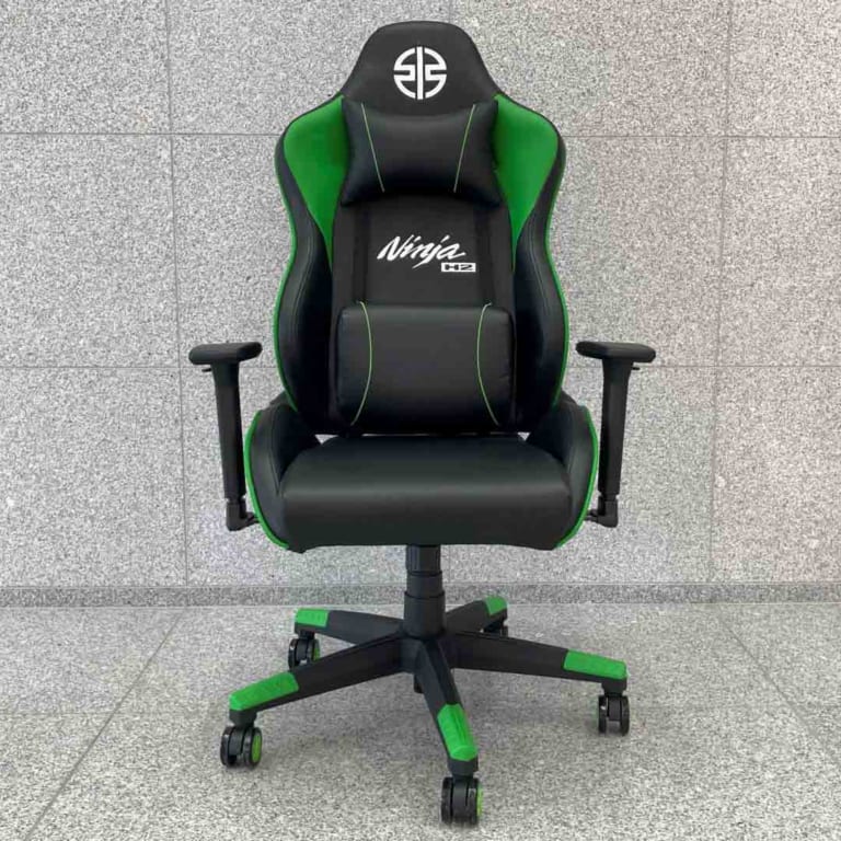 自宅やガレージ、オフィスでもカワサキを感じることができる「ゲーミングチェア Ninja H2」。フロントには、カワサキのフラッグシップモデル「Ninja H2」と”H2″を象徴する川崎重工業の「リバーマーク」ロゴの刺繍を施し、パイピングやキャスター部分をはじめとする各部にカワサキのイメージカラーであるライムグリーンを採用している。