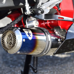 こちらはダウンタイプのレーシングマフラー(現在開発中)。排気口はメッシュ処理され、トリックスターのロゴマークも入る。オールステンレス製、11万8800円にて発売予定。