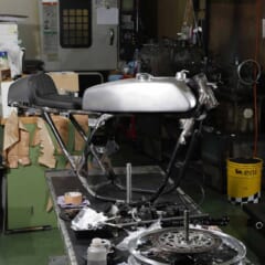 「OV40」と命名されたカワサキ空冷フォーを心臓に抱くスペシャルレーシングマシン。個人オーナーからのオーダーで、まさに完成間際。外装パーツは完成しており、ペイント依頼中だった。