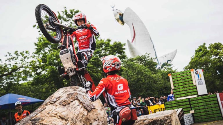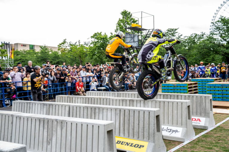 バイクのトライアルは、ロードレースやモトクロスと比べると比較的狭い会場でも競技開催が成り立つのが特徴。走る速度は低く見えても、立体的なバイクの動きを生み出す妙技は迫力満点だ。