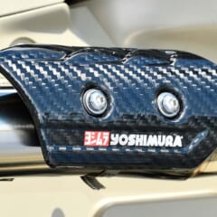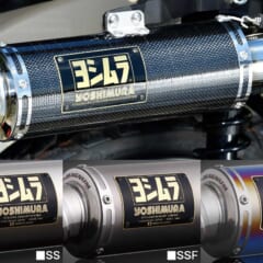 【ヨシムラ 機械曲 GPマグナム サイクロン タイプアップ エクスポートスペック 政府認証】カーボンのSC、ステンレスのSS、それをチタン風に加工したSSF、チタンを陽極酸化処理した鮮やかなブルーのSTBと、サイレンサーは4種から選択可。●価格:SS(ステンレスカバー)5万3900円 SSF(サテンフィニッシュカバー)5万6100円 STB(チタンブルーカバー)6万4900円 SC(カーボンカバー)6万7100円