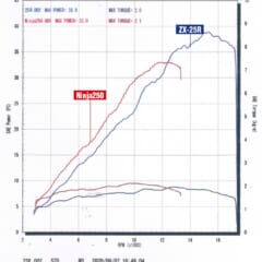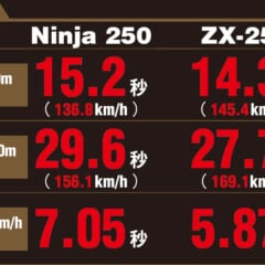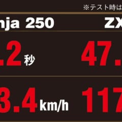 旧CBR250RRといい勝負になる数値を叩き出したニンジャ250(旧型CBRの計測結果は後日公開する)。