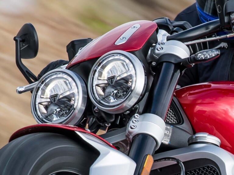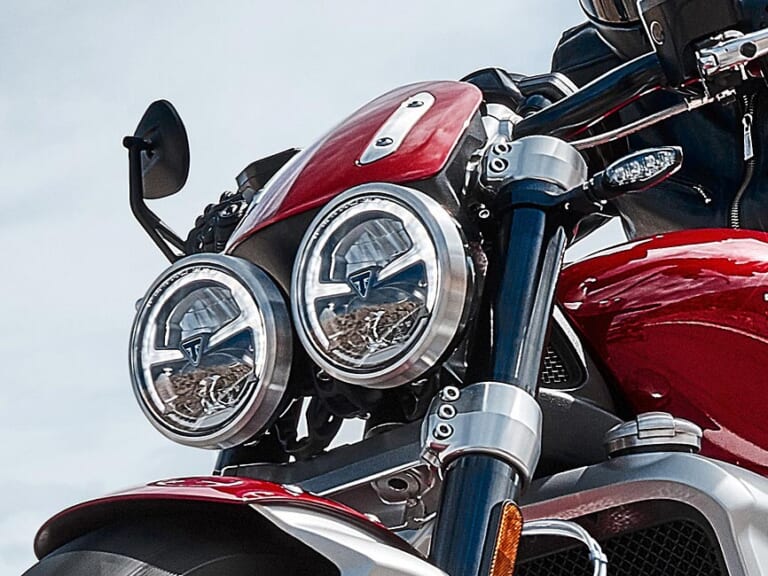 トライアンフの巨艦・ロケットR3は、丸眼中央に同社の「T」ロゴを配し、フチと中央の一部が光る独特なデザイン。量産バイク最大の2458ccにマッチした顔だ。国内版は上半分が光っており、独特な個性が目立ちにくい。