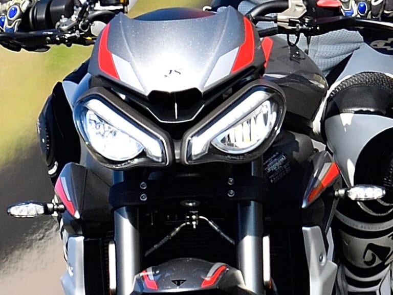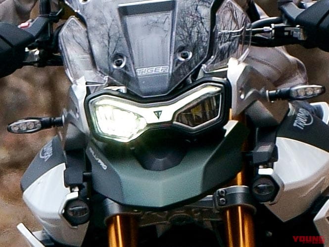 ’20で登場した新作・タイガー900シリーズは、眉毛がつながったV字DRLを採用。従来のタイガーより押し出し感が強くなった。国内版は右眼が点灯する。
