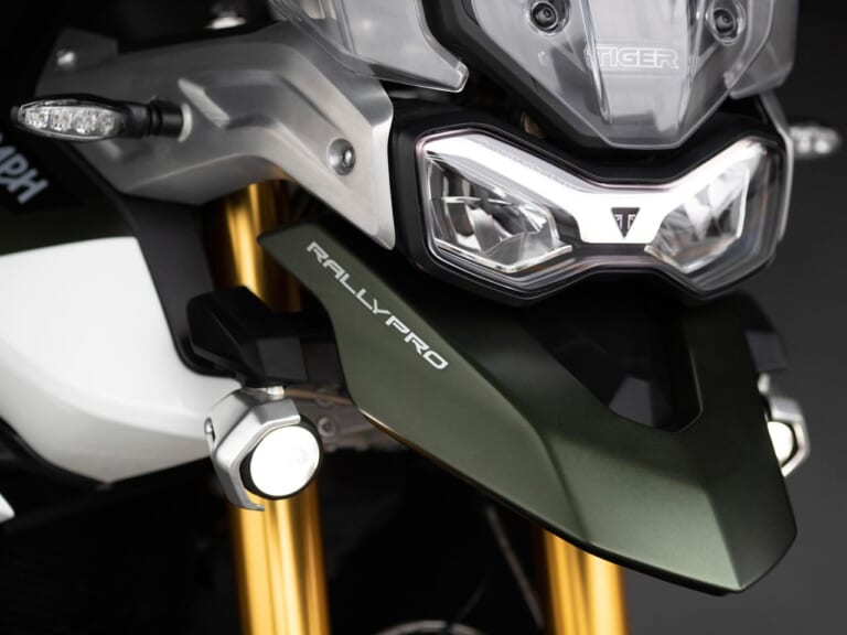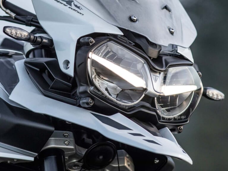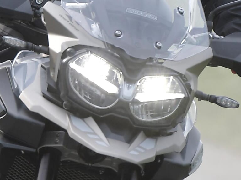 同社自慢の3気筒アドベンチャー・タイガー1200シリーズは、昆虫を思わせる異型2眼+横一線DRLが印象的。タイガー800も同様のデザインだ。