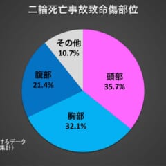 二輪死亡事故の致命傷部位を示したグラフ(2019年に警視庁が集計した東京都内のデータ)。頭部が致命傷となるのは安易に想像できるが、胸部や腹部がこれほど大きな割合を占めていることは、まだまだ認知度が低いと言えるだろう。