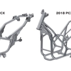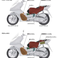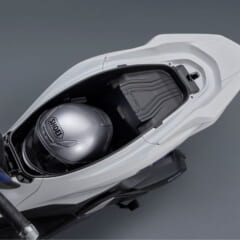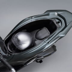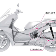 [PCX / PCX160 / PCX e:HEV]シート下収納スペースの拡大など、日常の使い勝手をさらに進化させた車体パッケージを実現するため、フレームを完全新設計とした。収納スペースは、PCX / PCX160では30L、PCX e:HEVも24Lに拡大された。ブレーキはフロントのみが作動する1チャンネルABSを全タイプに標準装備。リヤはディスクブレーキを新採用した。