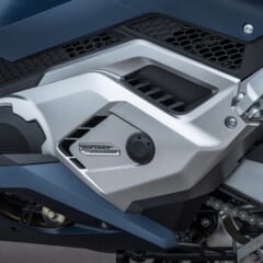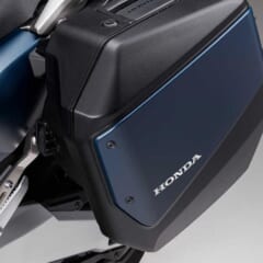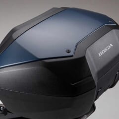 【ケース類も上質な仕立て】スクーターでは珍しく、純正サイドパニアをオプションで用意。アルミパネル採用で質感も抜群だ。リヤケースと合わせ、フルパニア化も可能。